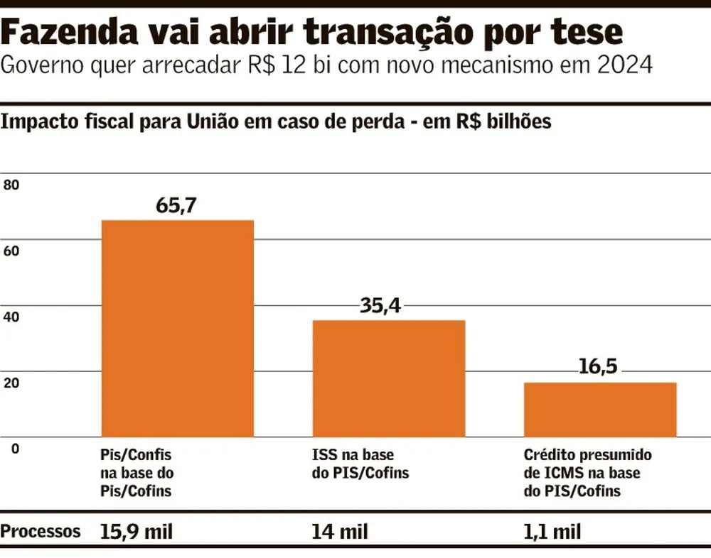 Outra tese que pode ser colocada aos contribuintes para transação se refere à inclusão do ISS na base de cálculo do PIS e da Cofins, que envolve quase 14 mil processos. De acordo com o governo, se a Fazenda perder essa tese, o impacto fiscal poderá chegar a R$ 35,4 bilhões, segundo o Projeto de Lei de Diretrizes Orçamentárias (PLDO) de 2024.
