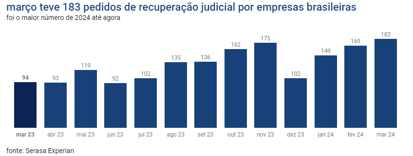 Foram registrados 183 pedidos de recuperação judicial por empresas brasileiras em março de 2024 –alta de 94,7% em comparação ao mesmo mês de 2023. É o maior número registrado neste ano. Os dados são da Serasa Experian.