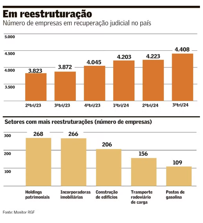 Os setores citados são alguns do que mais têm empresas em reestruturação no Brasil: holdings patrimoniais (268), incorporadoras imobiliárias (266), construção de edifícios (206), transporte rodoviário de carga (156) e postos de gasolina (109).